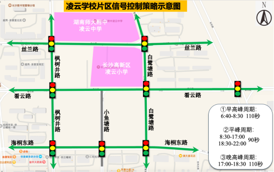 学校分布密集且流量适中的区域,对距离较近的相邻路口信号灯进行联动协调,并采取小周期模式,形成送学车辆快速通行的“绿波带”,提升家长送学车辆通行效率。以湘江新区凌云学校片区绿波区域为例。